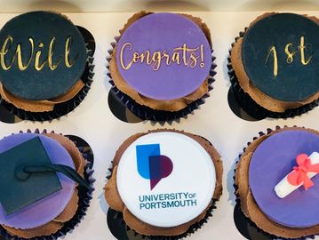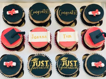 Available in boxes of 6 or 12, personalised box of vanilla or chocolate Graduation cupcakes, with handmade fondant decorations.Presented in windowed box with satin gift ribbon.