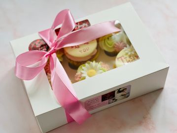 Available in boxes of 6 or 12, personalised box of vanilla or chocolate Thank You cupcakes, with edible printing and fondant Thank You discs.Presented in windowed box with satin gift ribbon.
