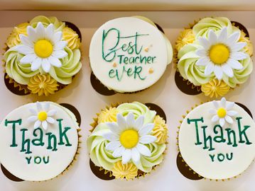 On a budget? Choose a box with just 1 fondant disc ('Thank You' or 'Best Teacher Ever') and 5 cupcakes with a simple swirl of buttercream and flower on the side for £17.50 (vanilla) or £20 (chocolate)