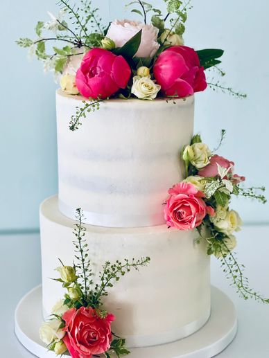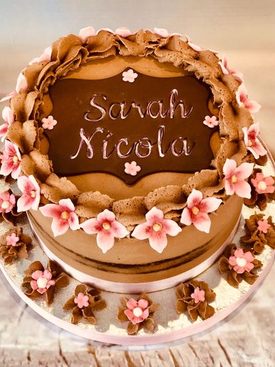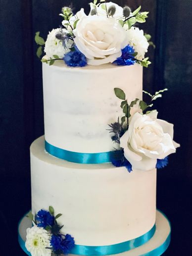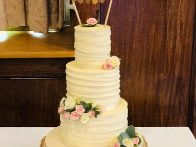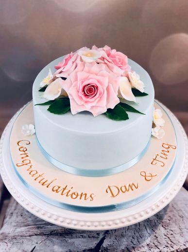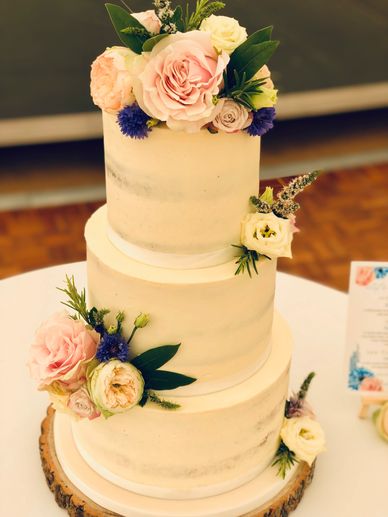 "Thank you so much for your beautiful, delicious cake, it looked absolutely stunning with the flowers on top. It was so delicious, Kevin and I had the job of looking after it at home! Sam came over the next day and we were able to pack most of it in a container for him and Shona to take home. Apparently it soon disappeared!
