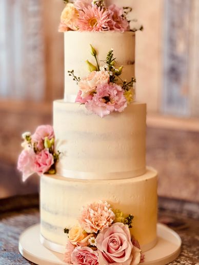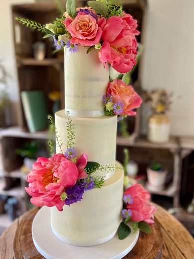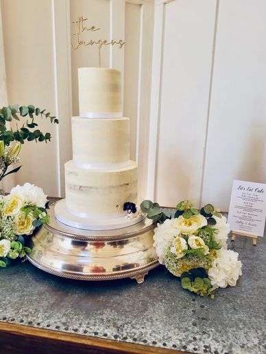 "We just wanted to say a huge thank you for our absolutely beautiful cake!! Not only did it look incredible together with Jo's flowers but of course it was delicious and we had so many compliments. Only a tiny bit made it home and we polished that off very soon after. I hope this is ok but I have given Mel at the barn one of your business cards. She tasted the cake and agreed that it was amazing. "