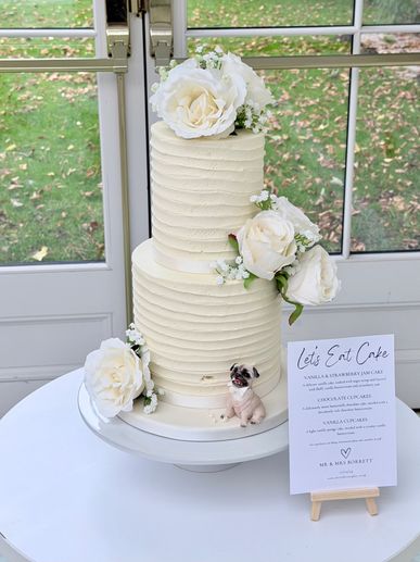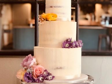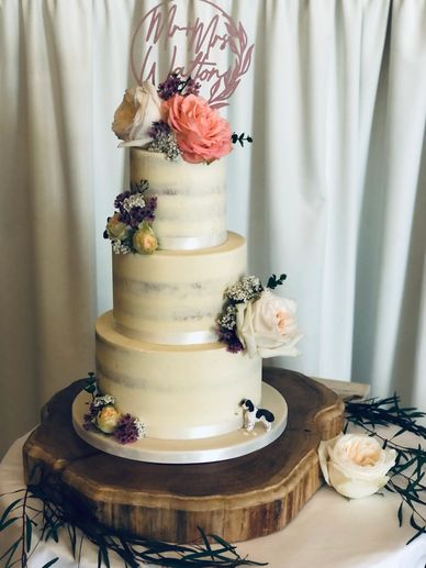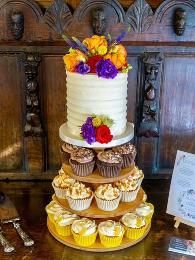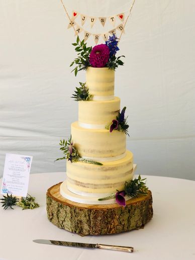 "We found 'a little big naughty' at a wedding fair, she was exhibiting a cake very similar to what we wanted! from the go ahead she was extremely communicative and accommodating, and we had the best experience with her. We had vegan cupcakes to surround our main cake, and this were so good that even the most stubborn meat eater couldn't tell! The cakes were extremely generous/ tall and we ended up with lots left over, I wish I had taken onboard Michelle's warning over cake sizes/quantities. We had a three tier cake of different flavours and then a forth flavour in the vegan cupcakes. We still have some cake in the freezer, and are hoping it will last as it tasted amazing!"
